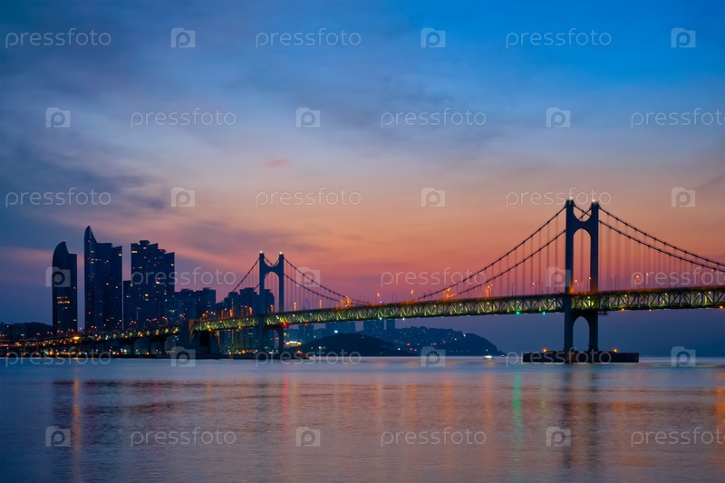Мост Гванган на рассвете с небоскребами и драматическим небом.Бусан, Южная Корея