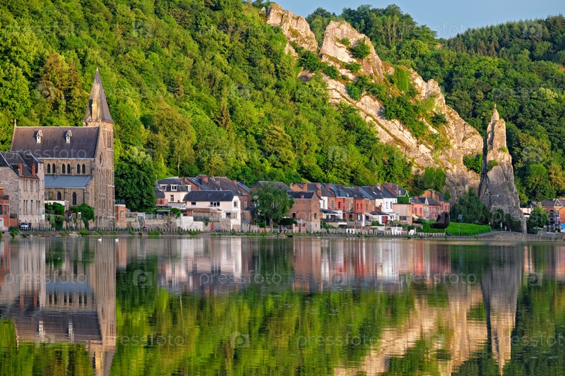 Вид на живописный город Динан над рекой Маас Динан - валлонский город и муниципалитет, расположенный на реке Мейзе в бельгийской провинции Намур при закате солнца с скалой Байарда и шоссе