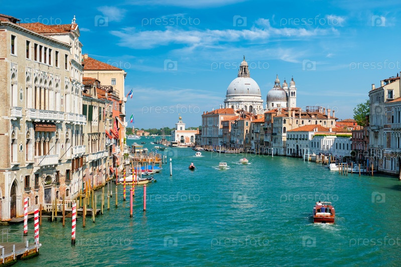 Вид на Большой канал Венеции с лодками и церковью Санта-Мария делла Салуте в один день от моста Понте дель Академия