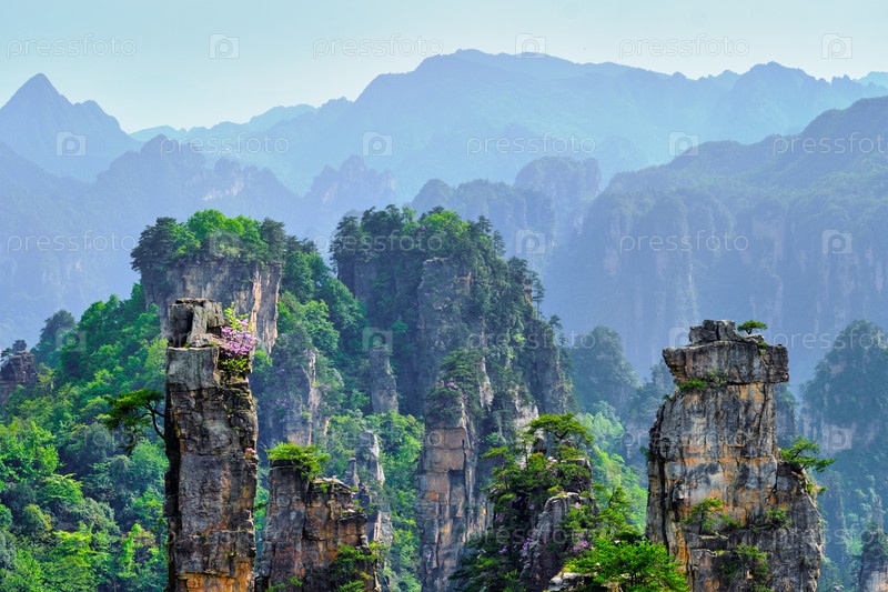 Известная туристическая достопримечательность Китая - каменные столбы скальных гор Чжанцзянджи при закате солнца в Улингюане, провинция Хунань, Китай