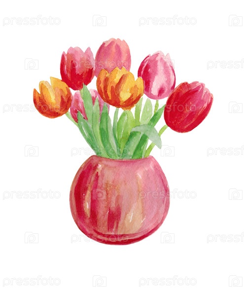 Яркие тюльпаны в вазе Букет цветов, изолированный на белом фоне Иллюстрация написана от руки акварельной краской