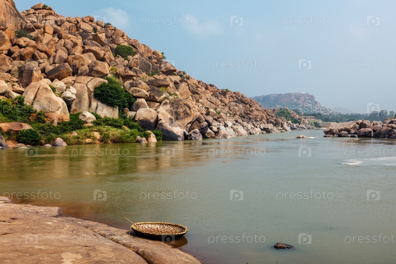 Традиционно тканеная лодка в Хампи на берегах рек Тунгабхадра, Хэмпи, Карнатака, Индия