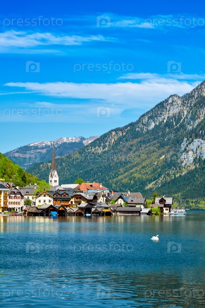 Лебедь в озере напротив деревни Халлштат на Холлстатте Смотрите в австрийских Альпах. регион Зальцкаммергута, Австрия