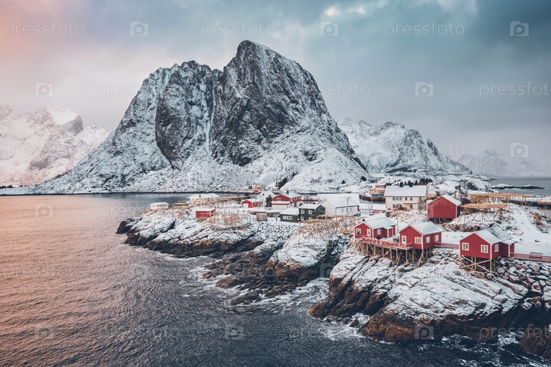 Известная туристическая достопримечательность рыбацкая деревня Хамна на Лофотенских островах, Норвегия с домами из красного руербу