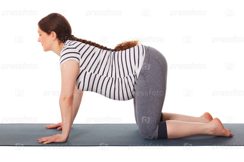 Упражнения йоги во время беременности - беременная женщина, выполняющая коровьи асаны, позирует для Битиласана в изоляции на белом фоне