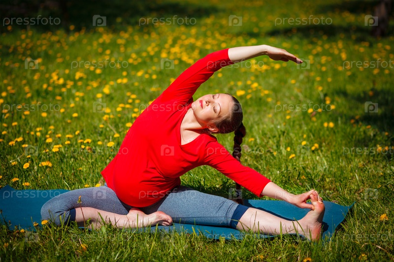 Йога упражнения для беременных женщин асан Parivrtta Janu Sirsasan Восстановленная голова до колена Позиция под открытым небом на травяной лужайке с одуванчиками летом