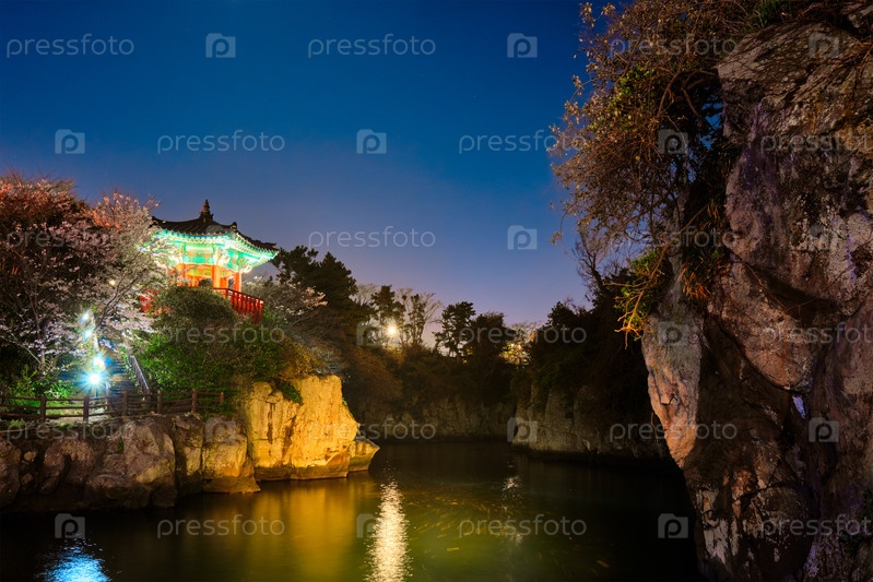 Озеро Йонген с павильоном Юнен, освещенное ночью на островах Чеджу, Южная Корея