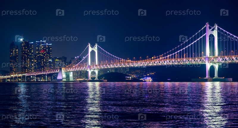 Мост Гванган и небоскребы освещаются ночью.Бусан, Южная Корея