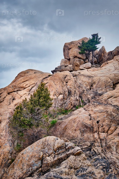 Скала с сосновыми деревьями в пасмурную погоду. Национальный парк Сеораксан, Южная Корея