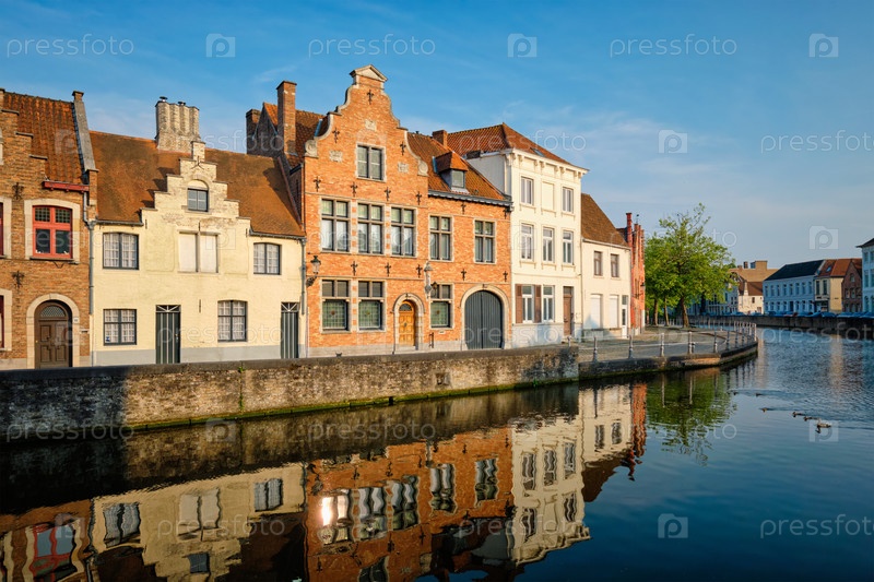 Типичным бельгийским городским ландшафтом Европы является концепция туризма - канал и старые дома при закате солнца