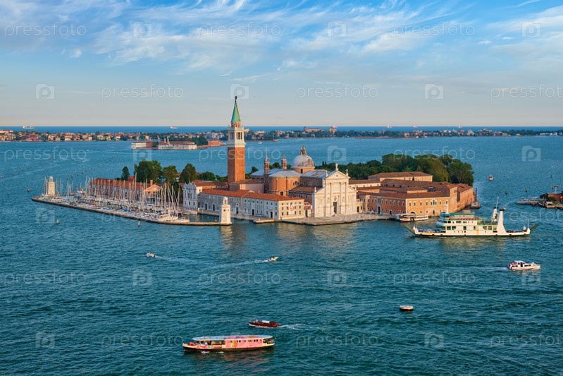 Вид с воздуха на Венецианскую лагуну с лодками и церковью Сан-Джорджио ди Маджоре