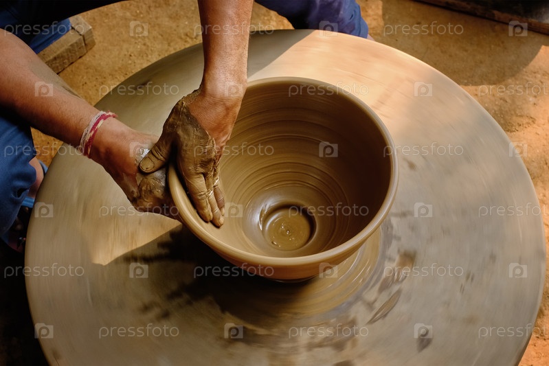Керамика - умелые мокрые руки гончарника, формирующие глину на горшечном колесе. Кастрюля, метание вазы. Изготовление традиционного индийского ремесла миска, банка, кастрюли, кувшина. Шилпаграм, Удайпур, Раджастан, Индия