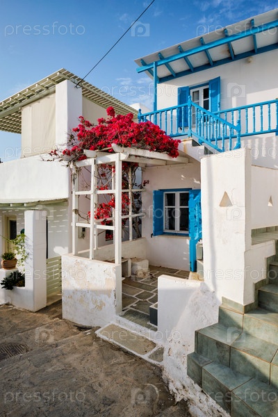 Живописная узкая улица с традиционными белыми домами с цветущими бугенвильскими цветами города Науза в знаменитой туристической достопримечательности острова Парос, Греция