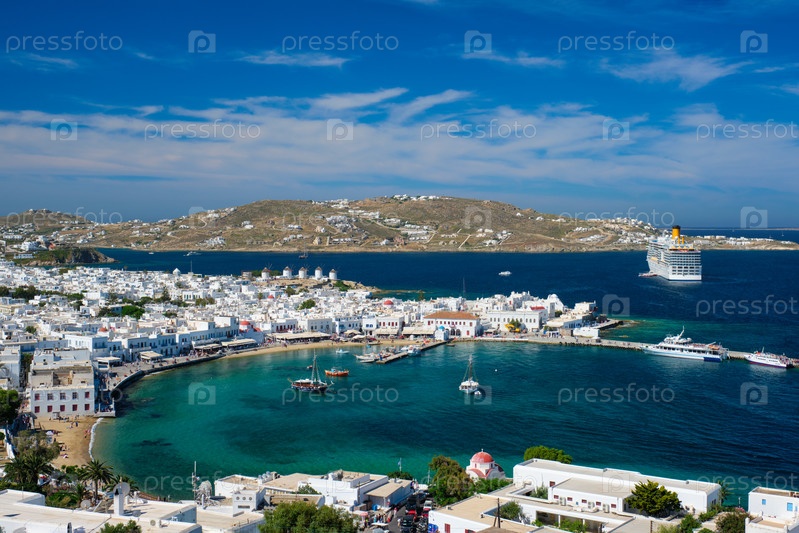 Вид на Миконос - это греческий туристический курорт с известными ветряными мельницами и портом с лодками, яхтами и круизным судном