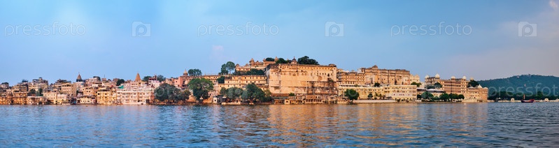 Панорама знаменитой романтической роскоши Раджастана Индийская туристическая достопримечательность - Udaipur City Palace при закате солнца с облачным небом
