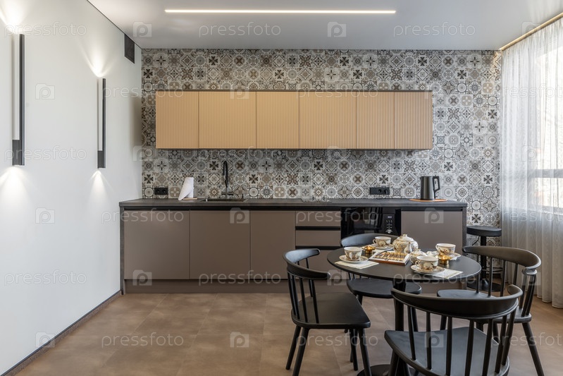 Современный кухонный интерьер с рисованными бежевыми шкафами, черной обеденной мебелью и естественным светом создает теплый элегантный вид