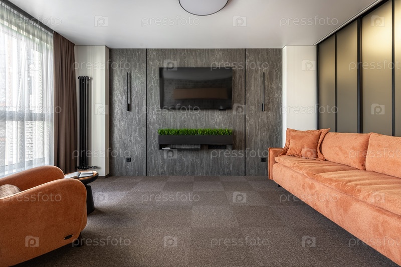 Современный интерьер гостиной с оранжевым диваном, креслом и текстурированной серой стеной с телевизором и декоративной зеленью
