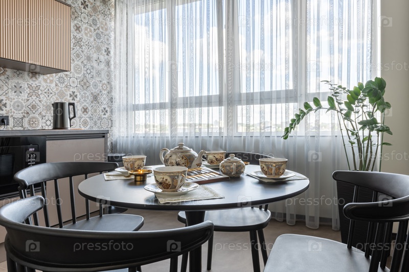 Порцелановый чай с чашками и чайником на черном круглом столе в ярком современном кухонном интерьере с большими окнами