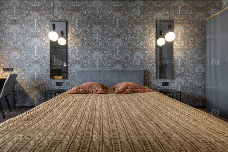 Современный интерьер спальни с рисунковой обои, серой головной доской, горчичным одеялом и мягким освещением от висящих ламп