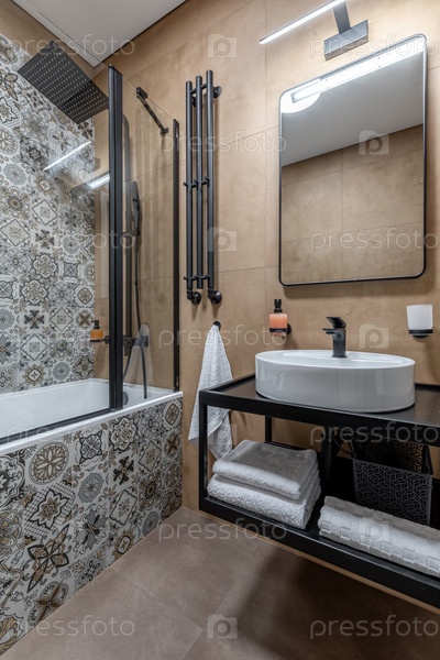 Элегантный современный интерьер ванной комнаты с декоративными плитками, черные лампы, круглый раковина и мягкое освещение в современном дизайне квартиры