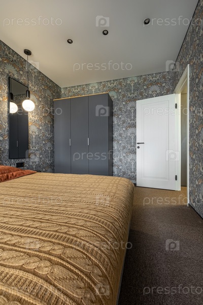 Современная уютная спальня с декоративными обоями, мягким освещением, гардеробом и теплым текстурированным одеялом на кровати