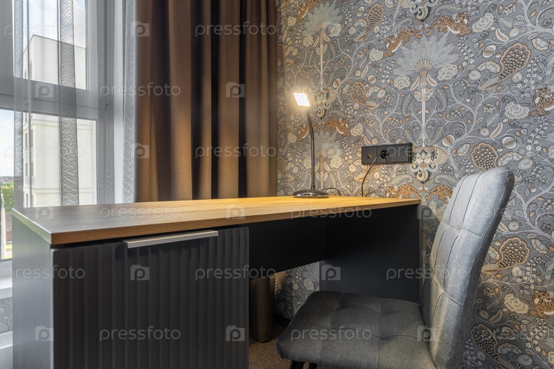 Стильное рабочее пространство с деревянным столом, серым креслом, рисунковой обои и мягким освещением от небольшой лампы возле окна со шторами
