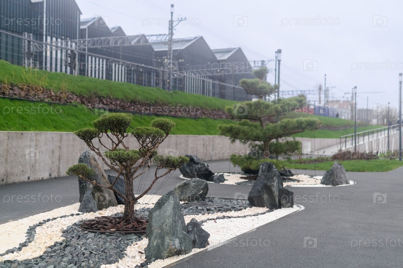 Восточный сад с деревом бонсай и каменным украшением в туманном городском пейзаже