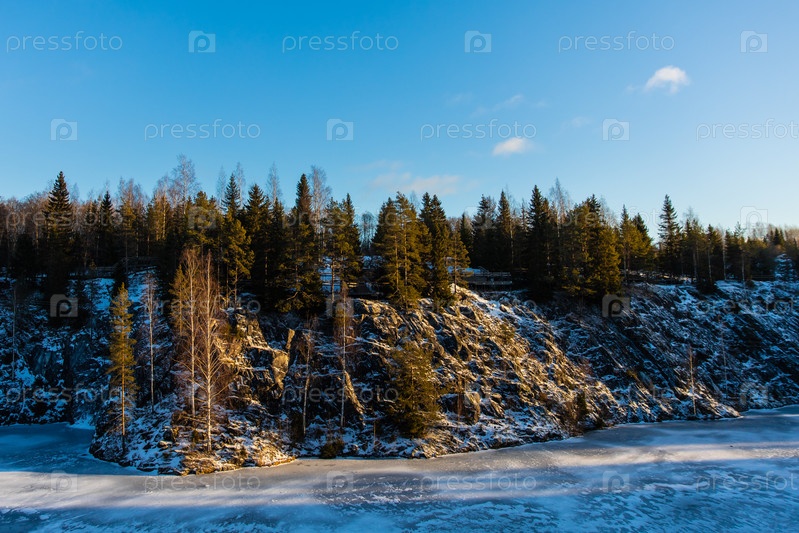 Скальное побережье и хвойный лес зимой в Рускеала