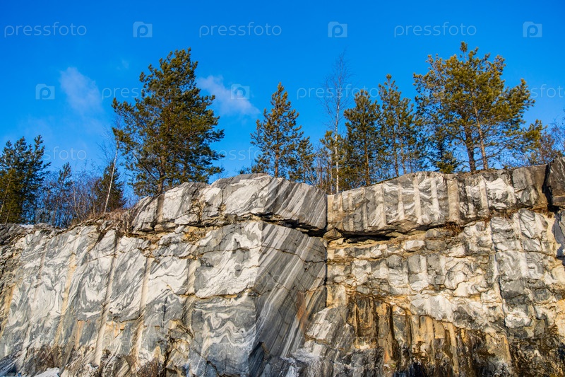 Мраморные скалы и сосновый лес на фоне голубого неба