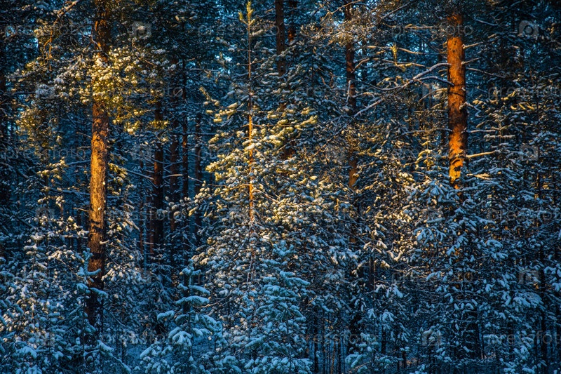 Зимний лес со снежными деревьями на закате