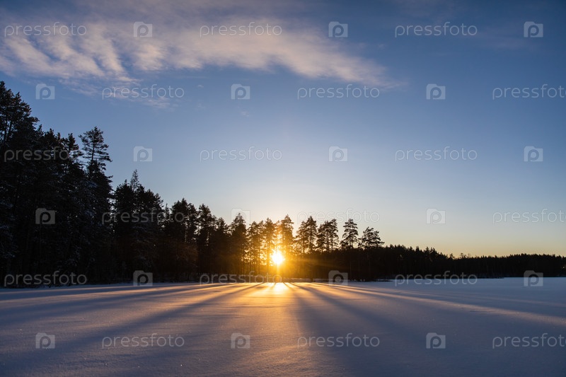 Зимний закат над лесом и замороженным Ладожским озером
