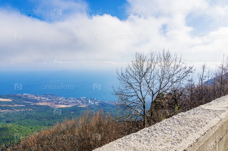 Панорамный вид на море и прибрежный город Ялту с горной тропы