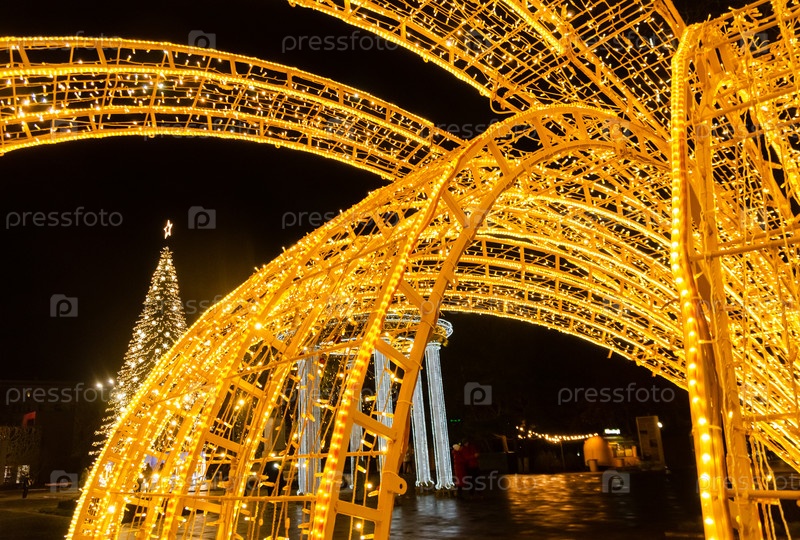 Яркий новогодний туннель из огней и рождественской елки на Ночной площади