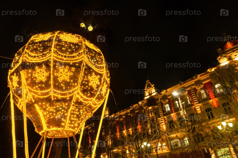 Новогодняя световая установка в виде воздушного шара на фоне исторического здания ночью