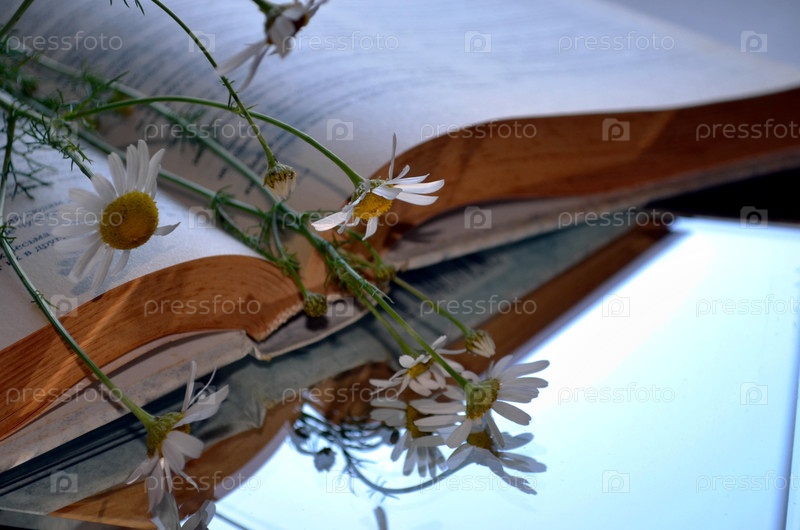 Цветы полевой ромашки и открытая книга на зеркальном фоне