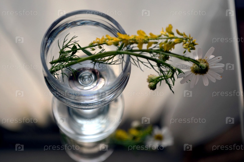 Цветы полевой ромашки и стеклянное стекло на зеркальном фоне