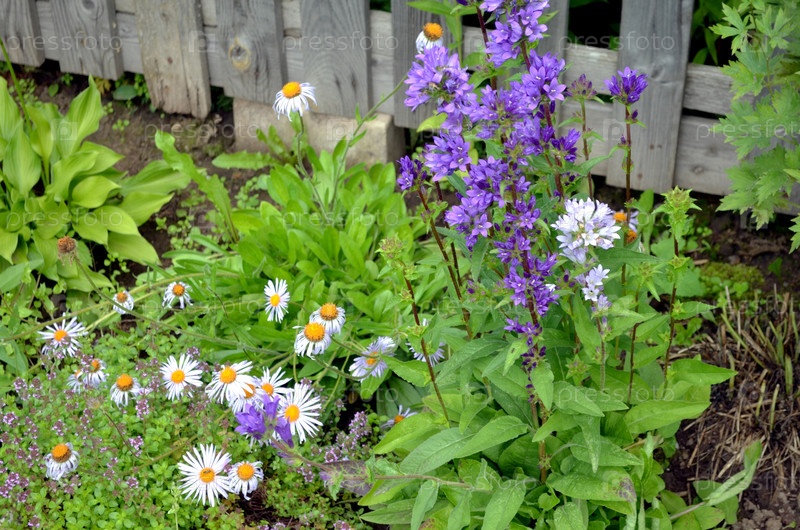 Цветы переполнены колокольчиком, тимьяном и многолетней астрой