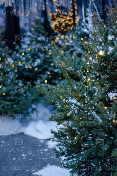Зимняя сказка: ветвь елей с огнями боке посреди сумерек