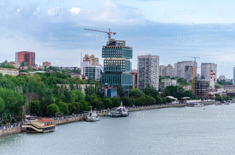 Пейзаж Ростова-на-Дону: вид на порт, реку Дон и мост на фоне городского развития