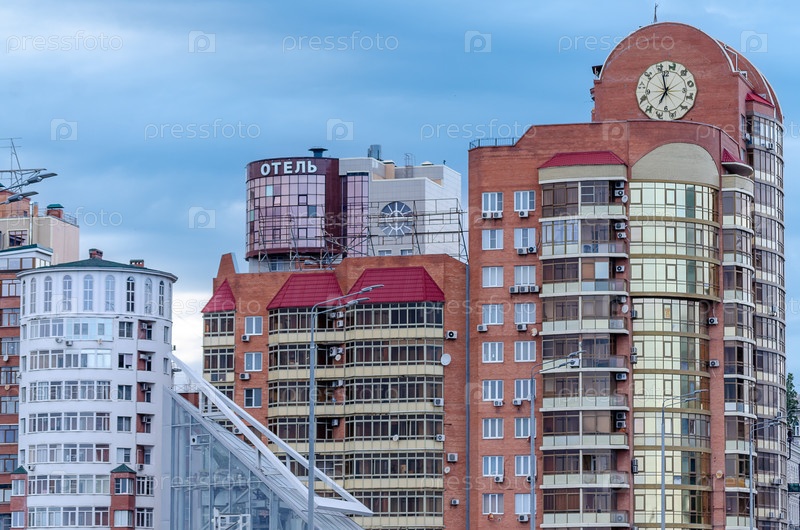 Современные жилые многоэтажки с зодиакальными часами против облачного неба