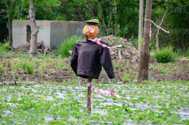Сламчатый боги в шляпе стоит на страже над молодым клубничным полем