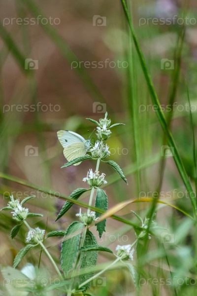 Белая капустная бабочка сидит на соцветии белых диких цветов среди густой зеленой травы