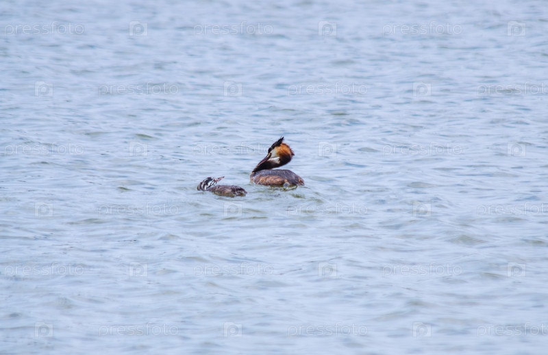 Птенчик большой лягушки (чомги) плавает рядом с родителем в спокойной, слегка волнистой воде