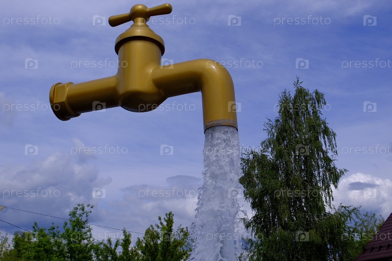 Макет крана с текущей водой на фоне неба и деревьев 19 мая 2025 года