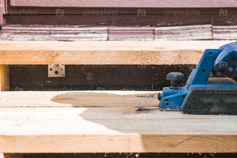 Использование ручной электрической ленты для обработки деревянной доски. Производство древесных изделий. Строительство, обработка древесины