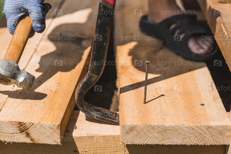 Удаление гвоздя с помощью ногтечника из деревянной конструкции.Ручные инструменты, старые строительные орудия