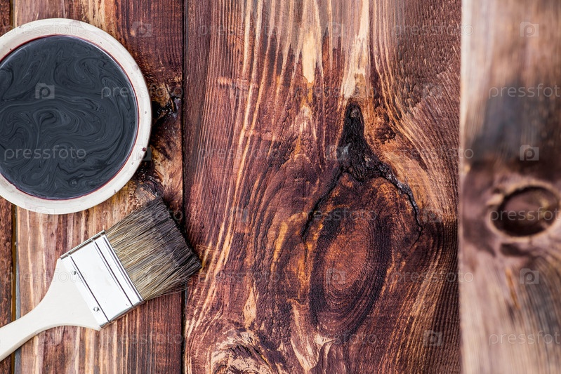 Рабочий наносит защитное деревянное пятно щеткой. Процесс защиты и покрытия деревянных досок. Реабилитация паркетного пола