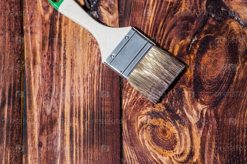 Рабочий наносит защитное деревянное пятно щеткой. Процесс защиты и покрытия деревянных досок. Реабилитация паркетного пола