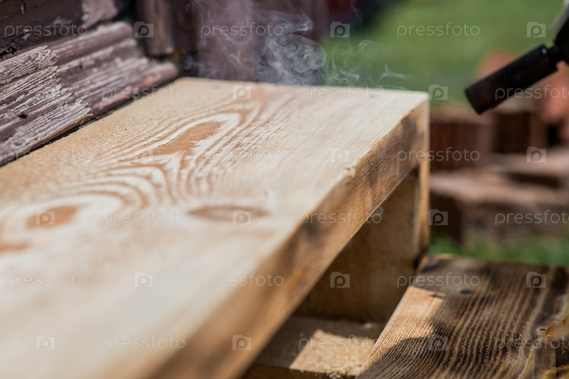 Текстура древесины обрабатывается на огне с помощью горелки.Процесс сжигания деревянных досок.Закрыть