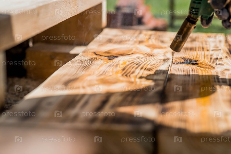 Текстура древесины обрабатывается на огне с помощью горелки.Процесс сжигания деревянных досок.Закрыть